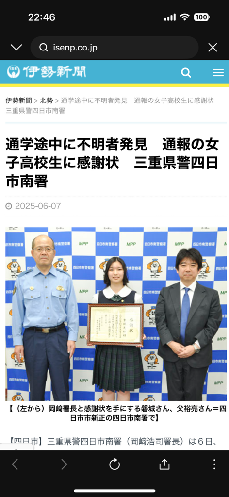 スタディー生へ感謝状!(川島校) 2025年07月17日 スタディー川島校の塾生(高2生)磐城更紗さんが、通学途中に 行方不明届が出されていた不明者を発見して通報し、重大事故の 未然防止と行方不明事案の解決に貢献したとして、四日市南署か ら感謝状が贈呈されました。大変誇らしく思います。 スタディー川島校 舘 川島校 最新の関連記事 第2回実用英語技能検定実施! 2025年10月04日 夏期講習修了、2学期開始!(スタディー川島校) 2025年09月05日 スタディー生へ感謝状!(川島校) 2025年07月17日 1学期末テスト対策授業! 2025年06月16日 ツイート シェア Google+1 はてブ pocket LINE