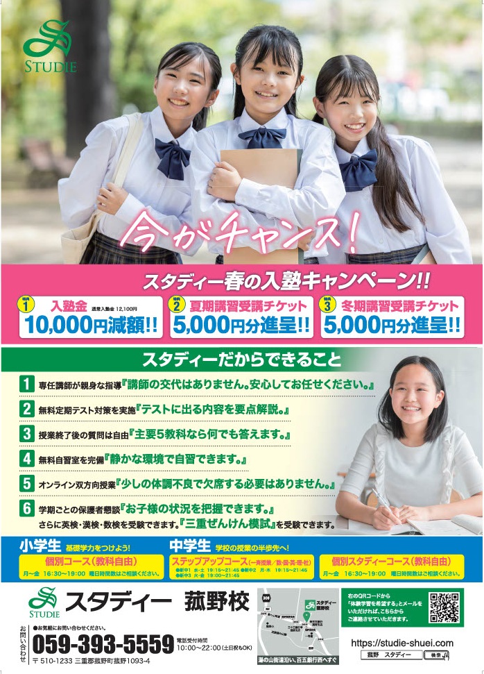 新学期開始、「春の入塾キャンペーン!!」スタディー菰野校